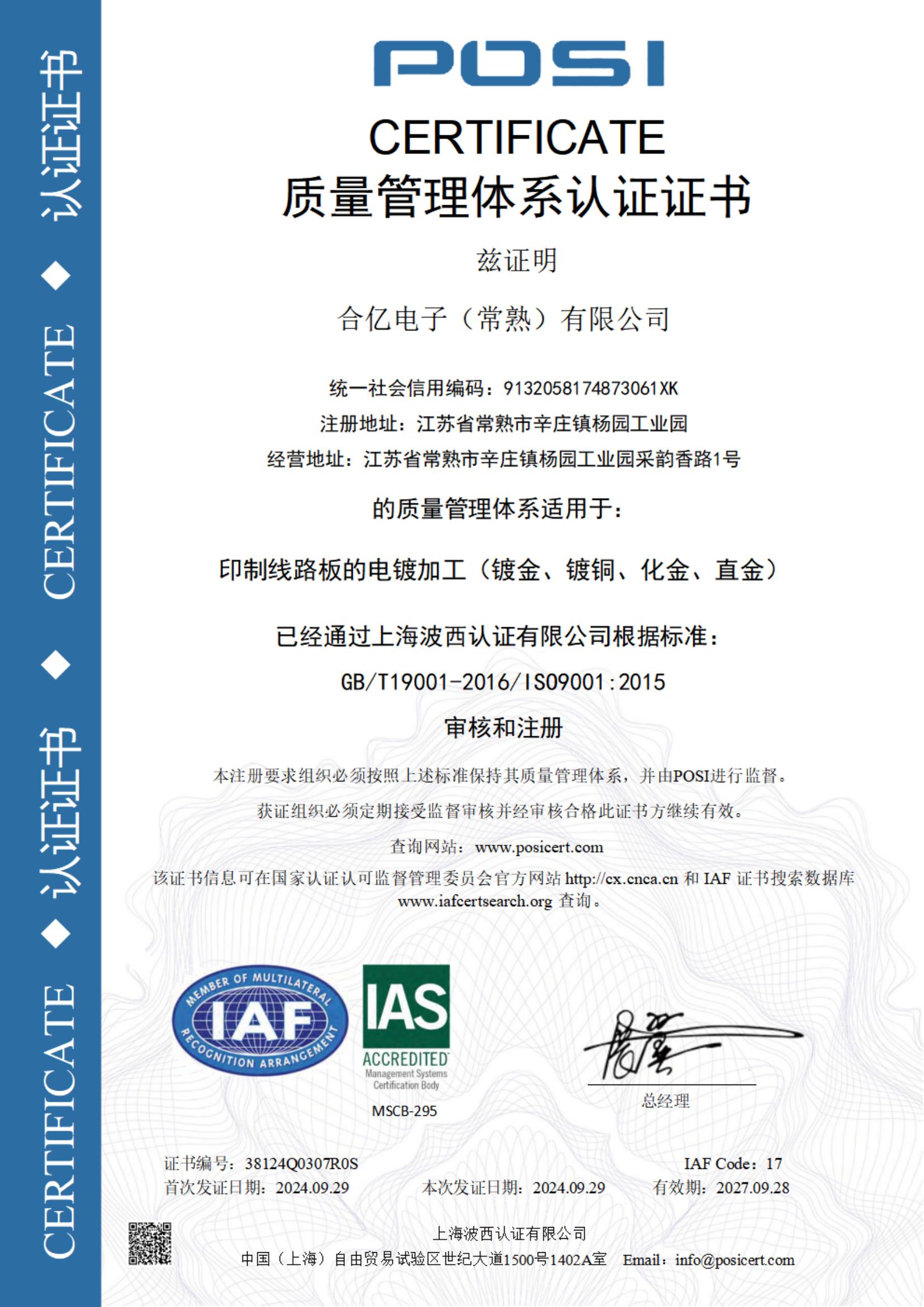 質(zhì)量管理體系認(rèn)證證書